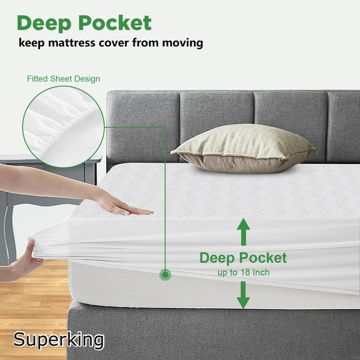 Fitted Sheet Style: Designed with deep pockets and a fully elasticized edge, our mattress protector fits snugly on mattresses up to 18 inches deep. Easy to put on and take off for hassle-free cleaning.
